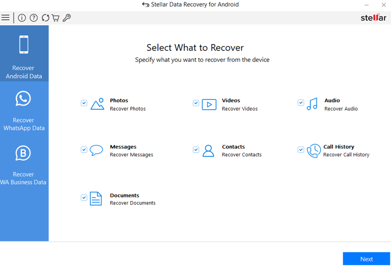 If you don’t have any aforementioned backup of your deleted WhatsApp Images, recovery can be challenging but not impossible at all. Fortunately, there are several Android data recovery software tools available online that can help you recover deleted chats and other WhatsApp files in a few simple clicks. Stellar Data Recovery for Android is a versatile tool which allows you to restore files (including WhatsApp Chats) deleted due to accidental deletion, formatting, or system errors. etc.